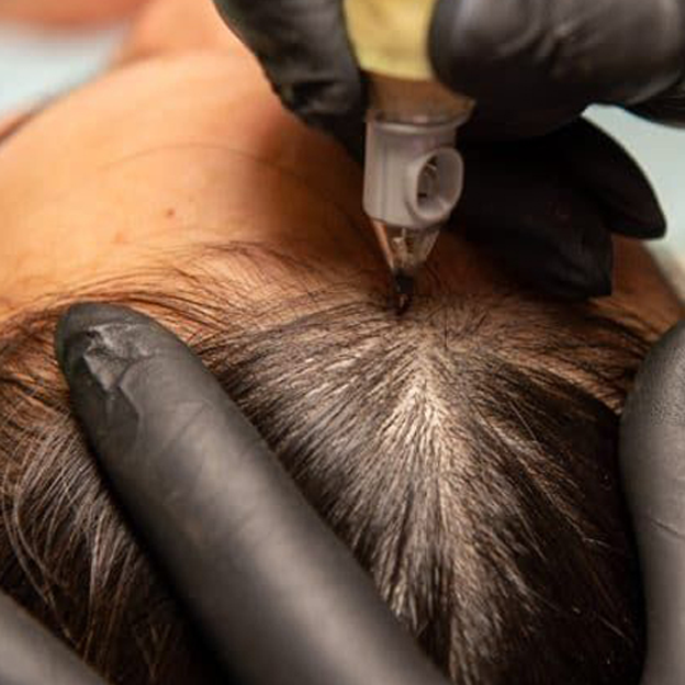 • Dabei werden feine Farbpigmente präzise in die oberste Hautschicht der Kopfhaut eingebracht.